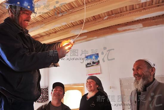 2014年3月30日,乌恰县供电公司员工在为74岁的村民艾山达吾提(右一)架线安装电灯。