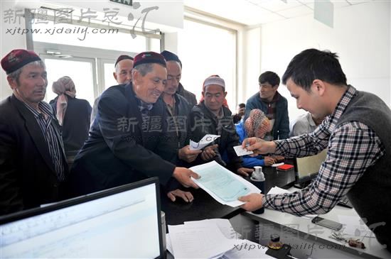 2014年4月1日,伊宁县愉群翁回族乡农民在乡农村信用社办理春耕生产小额信用贷款。