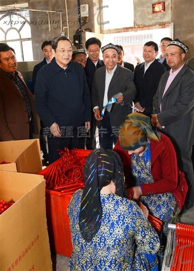 3月26日,俞正声在喀什市乃则尔巴格镇古勒巴格村垫肩制作厂调研。