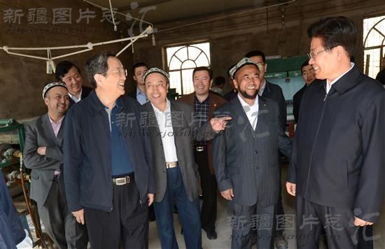 3月26日,俞正声在喀什市乃则尔巴格镇古勒巴格村垫肩制作厂调研。