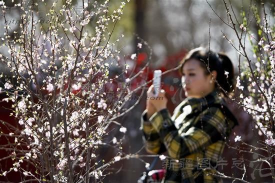 2014年4月2日,在乌鲁木齐市红山公园,游人在拍摄绽放的榆叶梅。