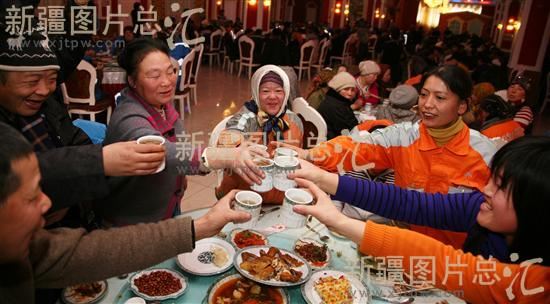 2012年1月19日,来自乌鲁木齐市大湾片区的环卫工人苗红梅与同事们碰杯祝福。当日,由自治区团委、自治区人力资源和社会保障厅及麦西来甫宴会厅共同举办的“外来务工人员新春年夜饭”活动在乌鲁木齐麦西来甫宴会厅举行。600名外来务工人员、环卫工人聚集一堂享用美食,共同迎接新春佳节的到来。
