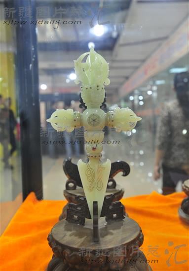 四件套玉雕作品《和田玉错金镶宝石四色佛教法器》之一。