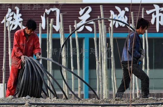 2014年4月5日,新疆生产建设兵团第二师二十九团职工在铁门关市工业园区铺设节水管。