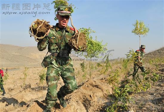 2013年10月23日,部队官兵搬运树苗。当日,乌鲁木齐市沙依巴克区组织驻区部队4500名官兵在雅玛里克山二期开展秋季义务植树劳动,种植金叶榆、沙枣树、红叶海棠等树种3万余株。