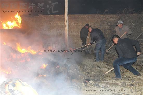 2014年4月7日,裕民县阿勒腾也木勒乡的干部群众在扑灭大火。