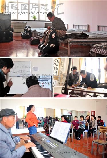 2014年4月10日,乌鲁木齐市水磨沟区旭东社区日间照料中心,一名老人在午休前使用按摩仪按摩脚底(上);工作人员在电脑室向老人介绍电脑的简单操作(中左);老人们在书画室练习书法(中右);夕阳红合唱团的团员在多功能室练习合唱(下)。