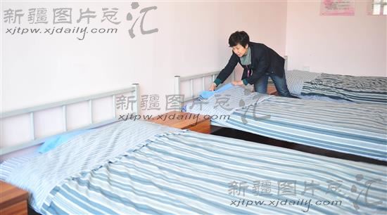 2014年4月10日,乌鲁木齐市水磨沟区旭东社区日间照料中心,工作人员在整理供老人午间休息的床铺。