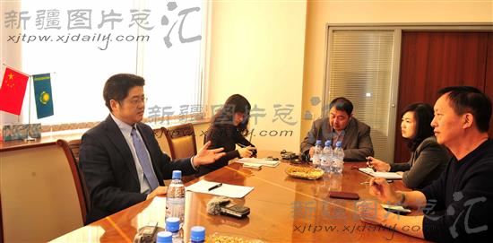 中国驻哈萨克斯坦大使乐玉成(左一)接收本报记者采访。