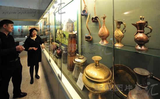 在哈萨克斯坦总统国家文化中心,工作人员在介绍有关丝绸之路文化的展品。