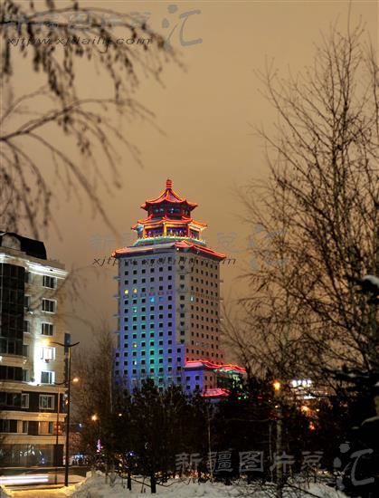 矗立在阿斯塔纳市的北京大厦(2014年3月11日摄)。北京大厦位于阿斯塔纳市新行政特区,是一个具有中式风格的集写字楼、酒店和商业为一体的现代化五星级综合大厦,地上25层,地下2层;建筑总高度为120.1米,停车位49辆,总建筑面积43100平方米,占地面积9600平方米。