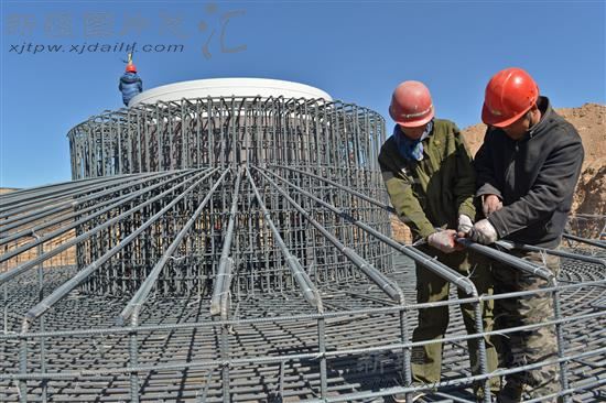 2014年4月10日,工人在三塘湖风电场修建风电塔基。