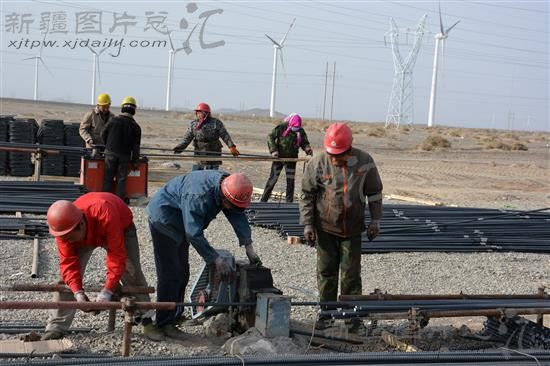 2014年4月4日,工人在三塘湖风电场施工。