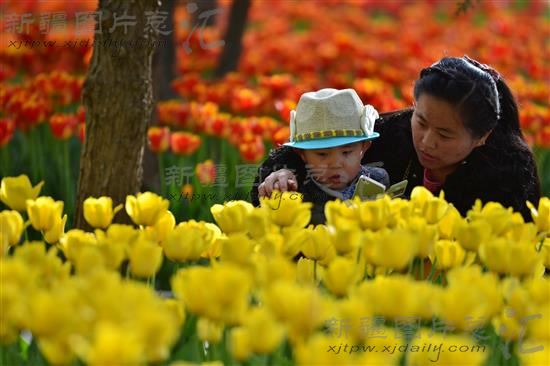 2014年4月11日,市民在新疆库尔勒市人民广场欣赏盛开的郁金香。