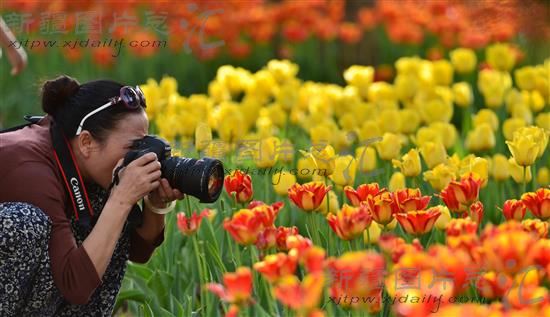 2014年4月11日,市民在新疆库尔勒市人民广场欣赏盛开的郁金香。