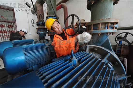 2013年9月27日,新疆克孜勒苏柯尔克孜自治州阿图什公路管理局供热站的技术人员在对天然气供暖供水设备进行保养。去年阿图什市投资6160万元,启动煤燃气锅炉供暖工程,并对这39个供热点进行了增容扩建改造。今年,全市基本实现燃气供暖。