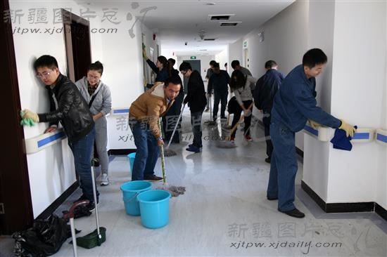2014年4月12日,克拉玛依市独山子区团委、独山子区志愿者协会的团员在爱老服务中心打扫卫生。