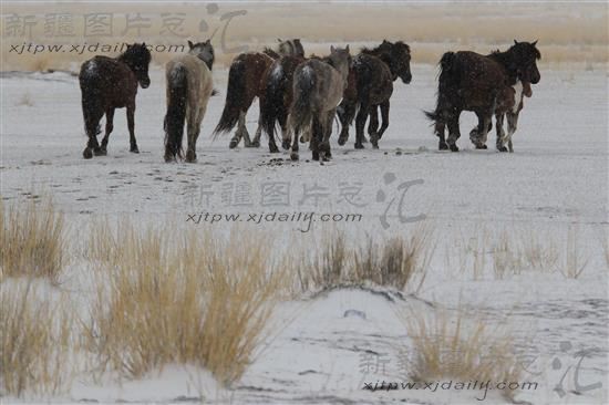 2014年4月15日,新疆巴里坤草原,马群在风雪中觅食。