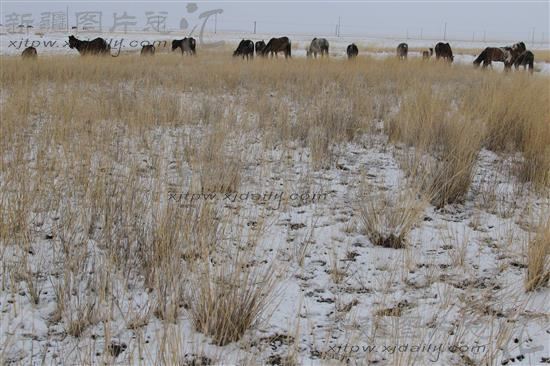 2014年4月15日,新疆巴里坤草原,马群在风雪中觅食。