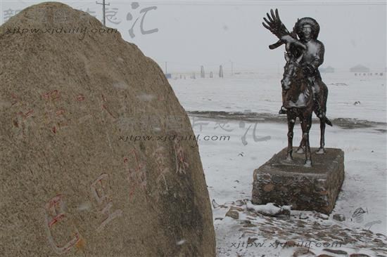 2014年4月15日,新疆巴里坤草原,哈萨克牧人雕塑笼罩在风雪中。