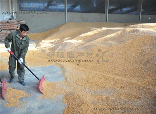 2013年11月2日,新疆塔城地区额敏县一饲料生产企业的员工在堆积刚入仓的玉米。今年玉米收购价格创新低,多数饲料企业忙于储仓。