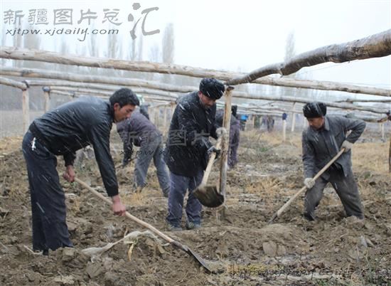 2013年11月9日,技术员在组织新疆克孜勒苏柯尔克孜自治州乌恰县阿克托海乡果农为14万株核桃幼苗埋土保暖,确保果树安全越冬。当日,乌什县迎来今冬第一场降雪。今年,该县阿克托海乡挂果的特色林果面积达4.7万余亩,果品总产量达2.64吨,林果业总收入8282万元,人均纯收入达2668元。