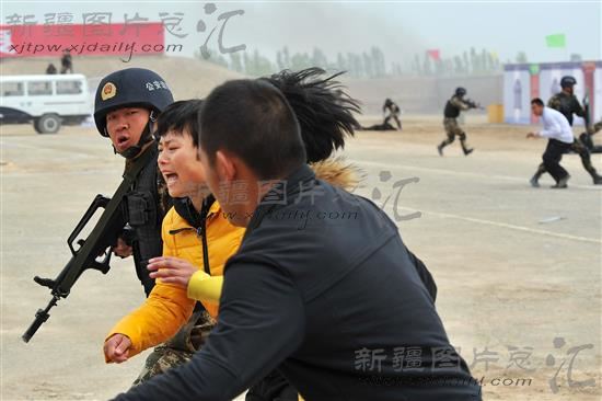 2014年4月15日,新疆公安边防部队战士在人员密集区反暴恐袭击处置演练中解救受困群众。