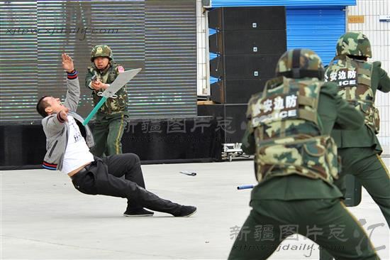 2014年4月15日,新疆公安边防部队战士在演练中果断出击,将一名冲入某基层派出所营区的持械“暴力恐怖分子”击倒。