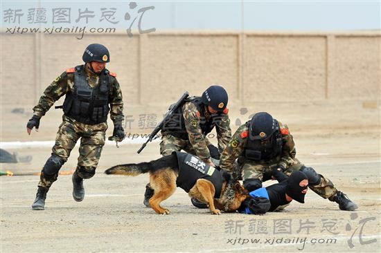 2014年4月15日,新疆公安边防部队战士们和一条警犬在演练中合力制服一名“暴力恐怖分子”。