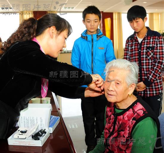 2013年11月14日,新疆昌吉市残联工作人员在为听力残障人士佩戴助听器。