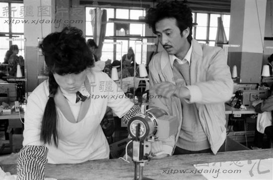 1990年5月,伊宁市童装厂为职业高中缝纫班免费提供实习场所,图为该厂厂长在车间指导学生操作。