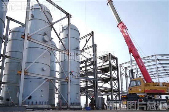 2023年10月30日,哈密高新技术产业开发区南部循环经济产业园,工人在新疆中和合众新材料有限公司年产100万吨羧酸及下游产品一体化项目建设现场安装净化装置关键设备。