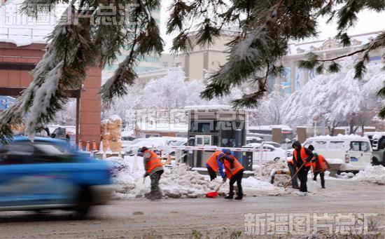 2023年11月3日,环卫工人在阿勒泰市街道清理积雪。
