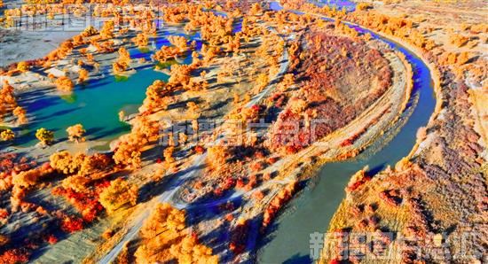 时下的罗布人村寨景区一片绚丽秋景,从高空俯瞰胡杨层林尽染,犹如一幅壮丽的画卷徐徐展开。罗布人村寨集合了沙漠、胡杨、河流、湖泊等自然景观,拥有独特的生态环境和美丽的自然风光。
