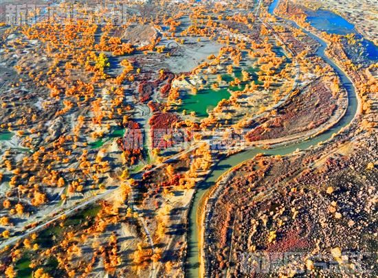 时下的罗布人村寨景区一片绚丽秋景,从高空俯瞰胡杨层林尽染,犹如一幅壮丽的画卷徐徐展开。罗布人村寨集合了沙漠、胡杨、河流、湖泊等自然景观,拥有独特的生态环境和美丽的自然风光。