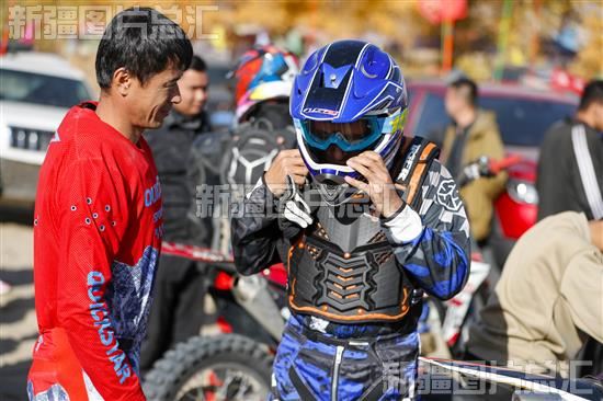 2023年11月5日,摩托车组选手在比赛前整理头盔。