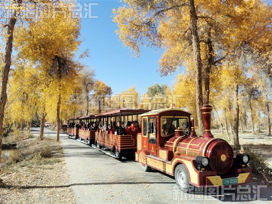 2023年11月4日,游客在阿瓦提县刀郎部落景区乘坐小火车赏胡杨美景。