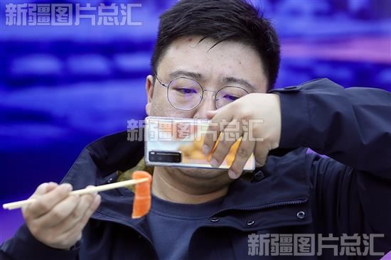 2023年11月4日,全媒体报道团队走进新疆鳟贵鲜食科技有限公司品尝三文鱼。