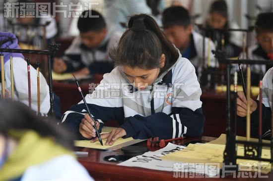 2023年11月7日,在阿克陶县雪松中学,“红杜鹃”书法社团的学生在练习书法。