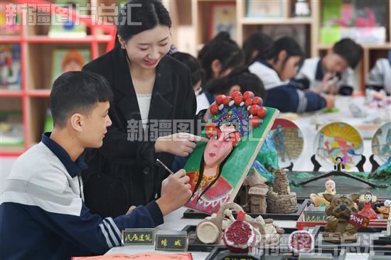 2023年11月7日,在阿克陶县雪松中学,“红杜鹃”陶艺社团的老师在指导学生陶艺制作。