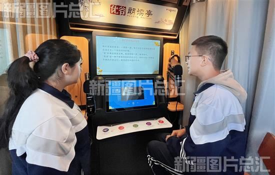 2023年11月7日,在阿克陶县雪松中学,“红杜鹃”诵读社团的学生在图书馆诵读亭诵读红色经典。