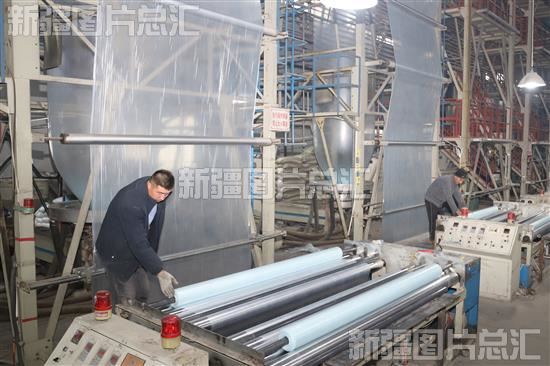 2023年11月11日,乌苏市富民农资有限公司工人在车间生产地膜。