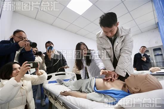 2023年11月10日,全媒体报道团队记者在塔城地区人民医院住院医师规范化培训基地参观采访。