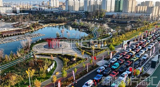 2023年11月11日,航拍由自治区体育局指导的2023年中国环塔(伊犁)分站赛在霍城县举行开幕式暨发车仪式(无人机拍摄)。