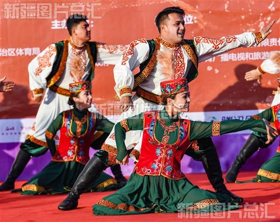 2023年11月11日,演员在2023年中国环塔(伊犁)分站赛在霍城县举行开幕式暨发车仪式上表演舞蹈。
