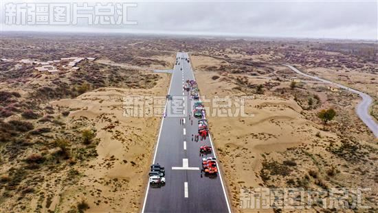 2023年11月10日,霍城县图开沙漠景区,参加2023年中国环塔 (伊犁) 分站赛赛道开放日的赛车在等待发车(无人机拍摄)。