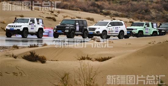 2023年11月10日,霍城县图开沙漠景区,参加2023年中国环塔 (伊犁) 分站赛赛道开放日的赛车在等待发车。