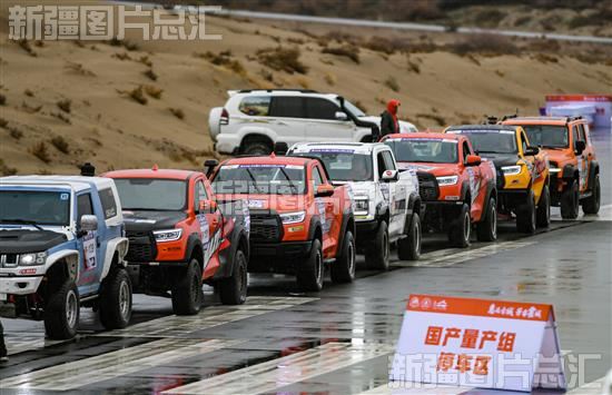 2023年11月10日,霍城县图开沙漠景区,参加2023年中国环塔 (伊犁) 分站赛赛道开放日的赛车在等待发车。