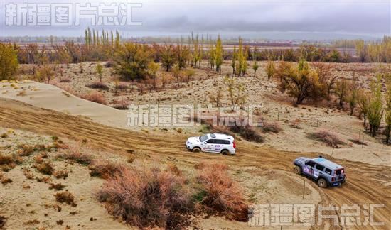 2023年11月10日,两辆赛车在2023年中国环塔(伊犁)分站赛赛道开放日上体验赛道路况(无人机拍摄)。