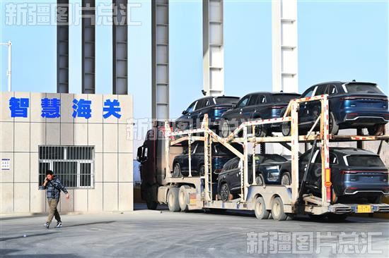 满载车辆的笼车准备从吐尔尕特口岸出境(2023年11月9日摄)。